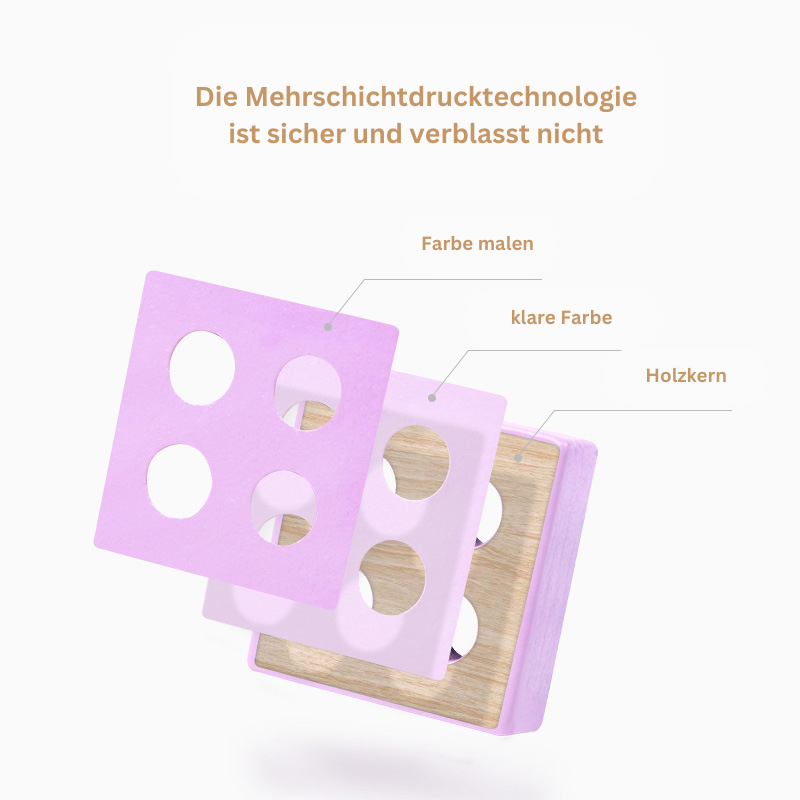 Das Montessori-Stapel-Puzzle besteht aus hochwertigem, langlebigem Holz und wird mit ungiftigen, kindersicheren Farben versehen, was für Langlebigkeit und Sicherheit sorgt. Da kleine Kinder ihre Spielzeuge gerne greifen und beißen, ist dieses Puzzle besonders robust und widerstandsfähig gegenüber rauem Spielverhalten.